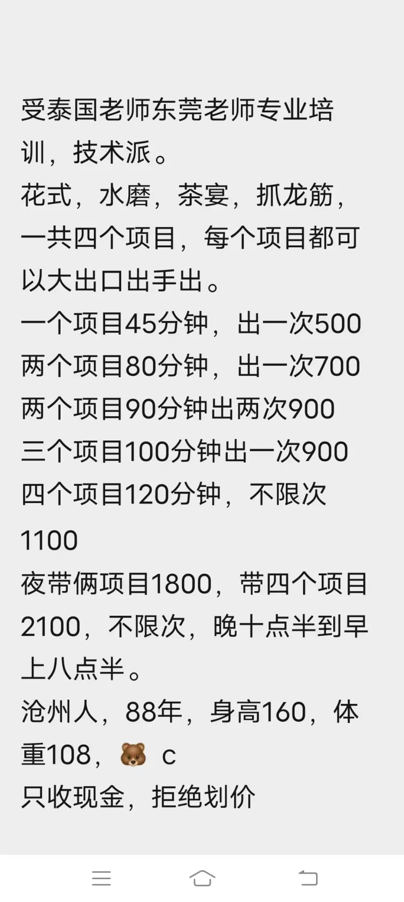 威客管理提示:要求付定金 保证金的,总之提前要钱的都是骗子 连着发了两个xbj的帖子了,今天来个dbj的!现在不喜好dbj了,偏爱xbj,但无奈昨天朋友非得去,只好跟着一起了! 这个地方称呼很多!有叫瘸子家的,有叫半地下室的,有叫蓝门的。昨天晚上九点来钟去的,很火爆!还不得有几十个ly等着,车水马龙和自由市场买菜一样!老板是个残疾人,瘸子,很牛逼!后台估计不是一般的硬!全运期间都没影响。夏天时去过几回,老板就柱个拐,坐在门口的电动山轮上抽着烟,门口进进出出的繁荣景象!进去里面的女老板好像也是个瘸子,也很拽的样子!这家的小姐也不都哪来的!都特年轻!颜值也非常的高!三十岁在那就相当高龄了!大部分都是二十二三岁的妹子! 现在天冷了,但里面的小姐,穿的都超级凉爽啊!本不想进去的,但粉色灯光加上高颜值的诱惑,大头败给了小头。进去一看,有一个穿的基本就是三点式,丁字裤一站起来,白白的大屁股就靠那么一条小布挡着!年轻、漂亮!估计任何ly进去了,都无法抵挡住这诱惑!太牛逼了! 通过防盗门进去,里面都是用布帘隔开的一个个小隔断,环境很简陋!夏天的时候来过,气味不太好!里面爆满,呻吟声此起彼伏!进去后让小姐把衣服都脱了,白花花的胴体太诱人了!活儿也就那点意思先kh,k硬了,带雨衣开干!女上男下、后入、最后男上女下出货,交钱走人! 属于快餐性质,环境挺差,但贵在小姐年轻、漂亮!性价比很高!不错,值得一去!