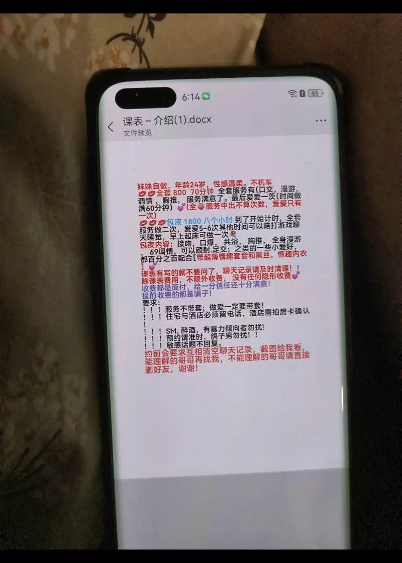 威客管理提示:要求付定金 保证金的,总之提前要钱的都是骗子 下午附近的人看到,觉得是兼职,加了之后,看朋友圈,各种丝袜高跟鞋,非常诱人,于是约好晚上上门,开好房,打电话让穿着高跟鞋丝袜来,结果说已经出门了,想想就算了,见面发现黑,矮,不过奶子大,精虫上脑就让她进门了,脱衣服洗澡,让给我口两下,结果真就两下,胸推也不专业,叫床瞎叫,一听就让人出戏,不配合,各种催,机车的一塌糊涂,还在瞎逼逼,最后恶心的我没射让她滚了,路费20,没零钱,给了她50,说表现好是小费,结果整这个b样,就让她退我,不退,差点儿没扇她,最后还是让她滚了,总之海阳的姑娘,让我极其失望